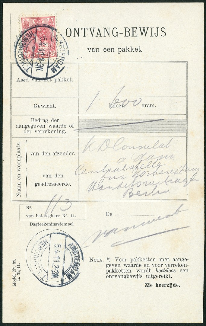 Ontvang-bewijs van een pakket voor Berlijn beplakt met 5c Bontkraag, afgest. Amsterdam/Hemonijstr.1 op 5-4-1911. Schaars formulier!