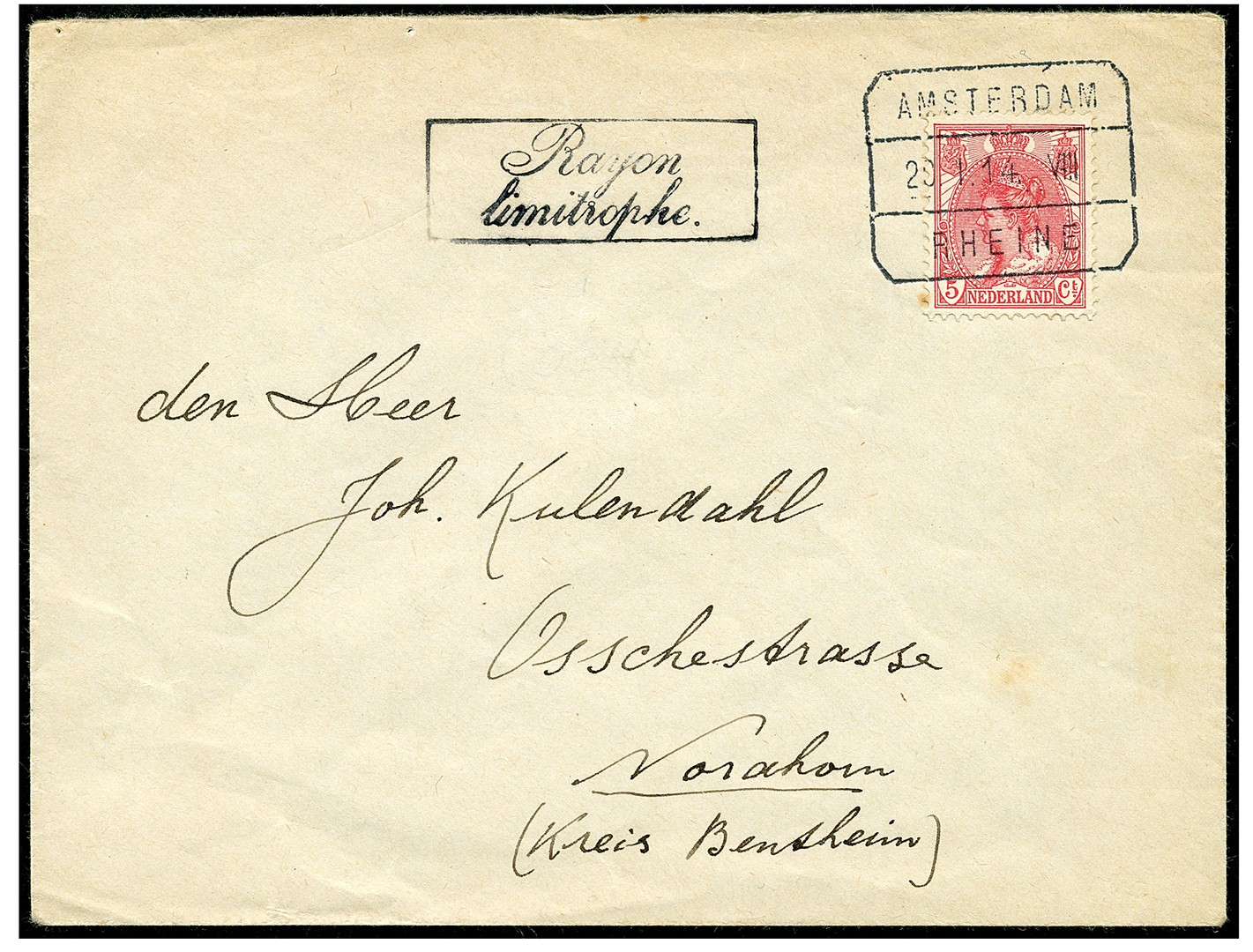 Env. met afz. uit Oldenzaal gefr. met 5c Bontkraag afgest. met trajectstempel Amsterdam/Rheine op 20-1-1914 naar Nordhorn, direct over de grens, met op vz. het zeldzame stempel ´Rayon/limitrophe.´ in kader (V.364), afgest. door het spoorwegpostkantoor i.v.m. 5c tarief voor grensverkeer. Zeldzaam stempel, ook de afdrukkwaliteit ervan!