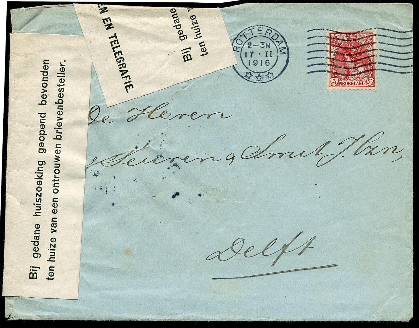 Env. (kopie originele brief zit er in) gefr. met 5c Bontkraag van Rotterdam 17-2-1917 naar Delft 17-2, voorzien van PTT-strook ´Bij gedane huiszoeking geopend bevonden/ten huize van een ontrouwen brievenbesteller.´