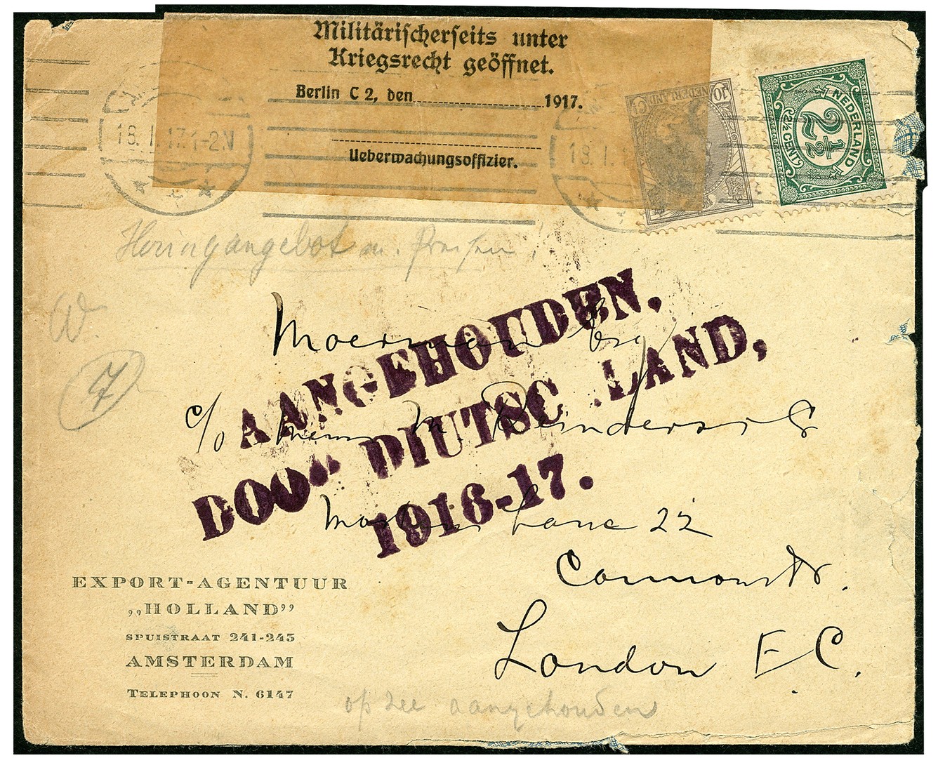 Firmacouvert (rechts wat ruw geopend) gefr. met 2½c en 10c van Amsterdam 161-1917 met bestemming Londen, geopend en voorzien van strook ´Militärischerseits unter/Kriegsrecht geöffnet´ want op zee ´AANGEHOUDEN,/DOOR DIUTSCHLAND,/1916-17.´