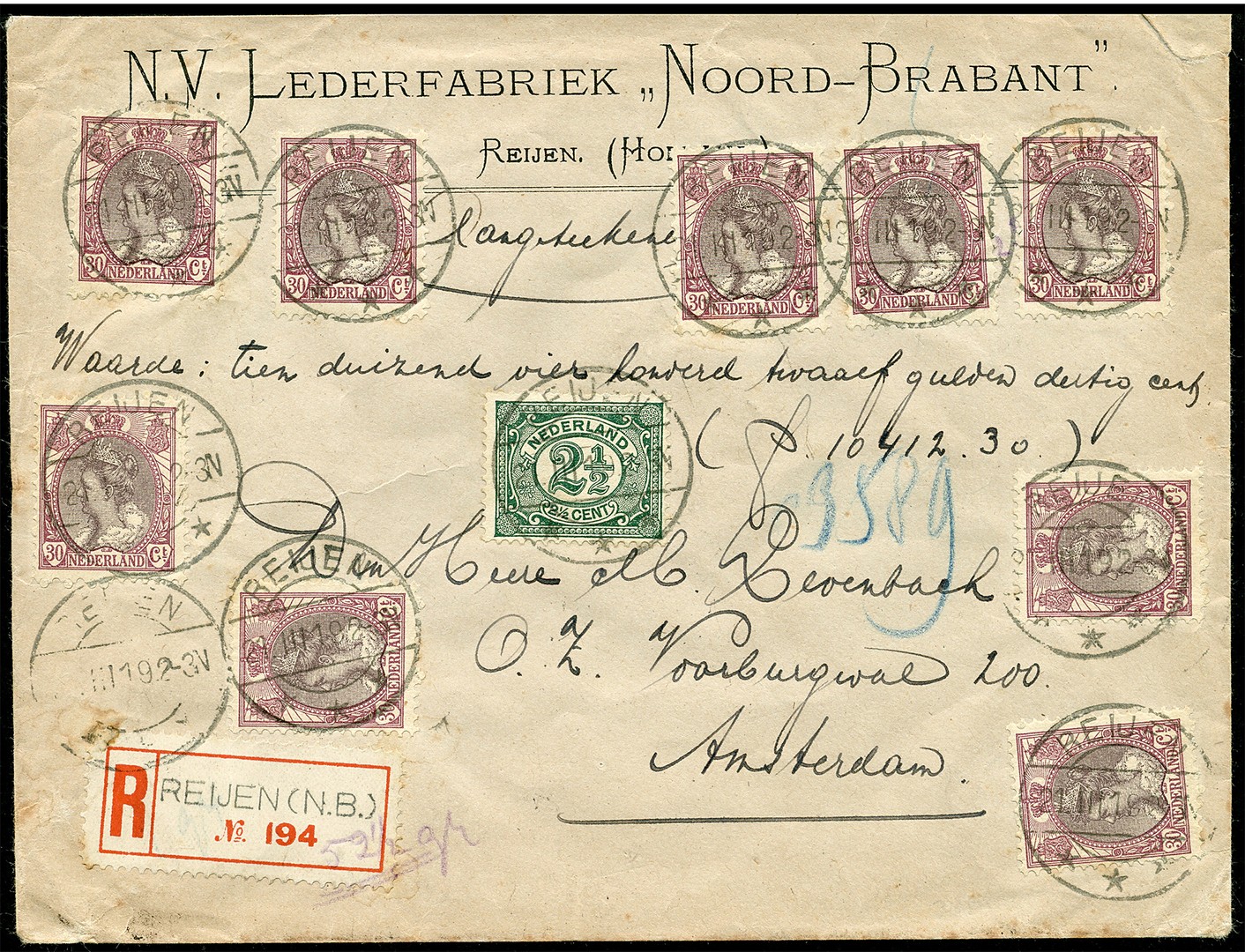 Envelop van een lederfabriek wegende 52½ gr. als waardebrief voor fl. 10.412 beplakt met maar liefst 9x 30c Bontkraag en 2½c van Reijen (N.B.) 21-3-1919 naar Amsterdam 21-3