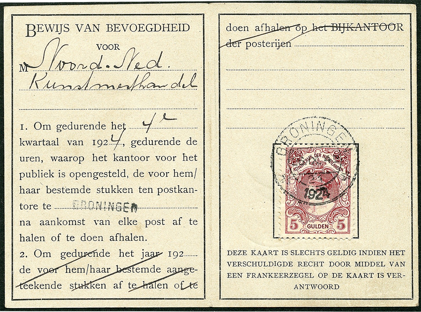 Postbuskaartje waarop 5 gld Bontkraag keurig afgest. Groningen 26-9-1924, voor het afhalen van stukken in het 4e kwartaal 1924