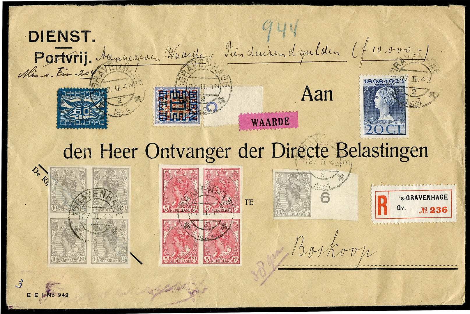 Grootformaat waardebrief voor het maximale bedrag van fl. 10.000 van 38 gram weelderig gefr. met nrs. 82/83 in blokken, 83, 125, 133 en LP3 van ´sGravenhage 27-2-1924 naar den Heer Ontvanger der Directe Belastingen te Boskoop 28-2. Prachtstuk, vooral voor liefhebber van posttarieven