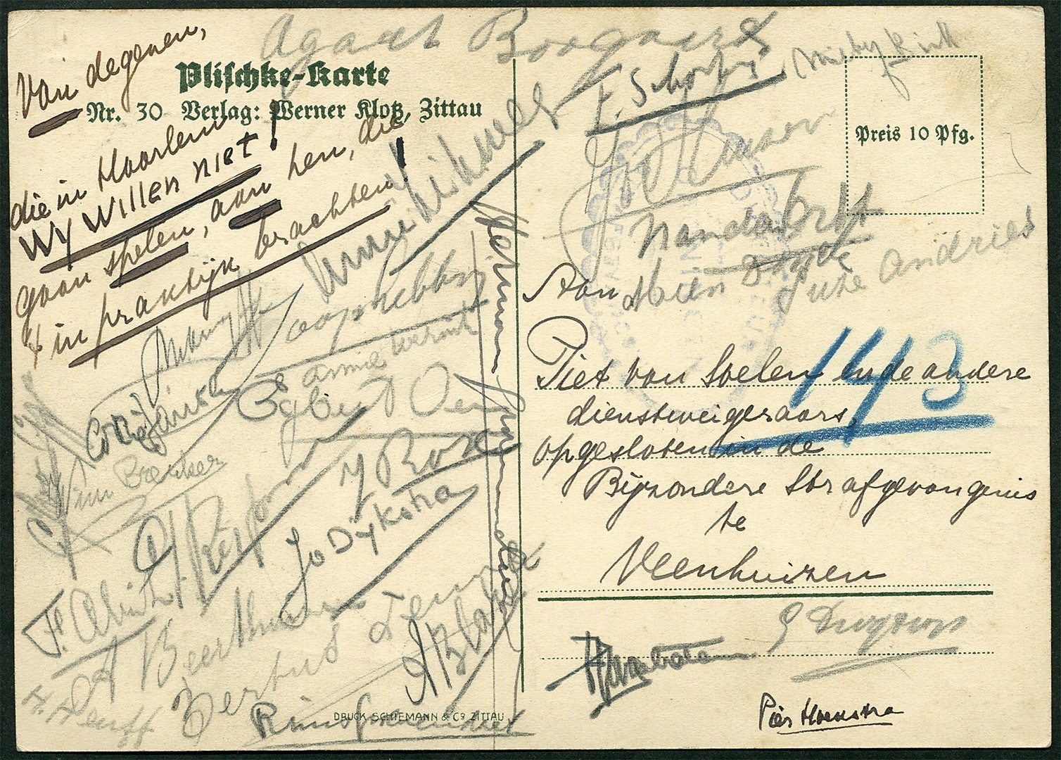 Dienstweigeraars. Drie prentbk., ongedateerd, niet via de post verzonden, vol met handtekeningen, met blauw ovaal stempel ´Directeur/GRONINGEN/Strafgevangenis´. Twee kaarten zijn naar Piet van Soelen (geb. 1911): bekend als links-extremistisch persoon (lijst uit 1939), wegens dienstweigering in 1931 opgesloten in Veenhuizen, in 1932 overgebracht naar de strafgevangenis in Groningen. Historisch!