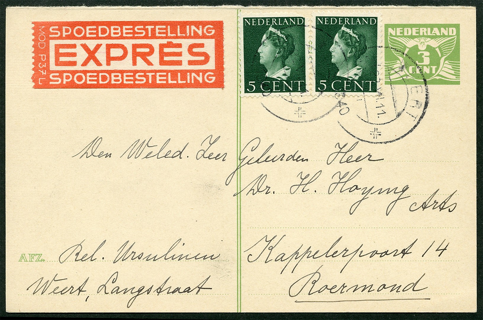 Bk. G229 V-kaart bijgefr. met 2x 5c van een Mère te Weert 22-7-1940 per expresse naar een arts te Roermond, waarmee zij onder begeleiding van Moeder Overste een afspraak heeft