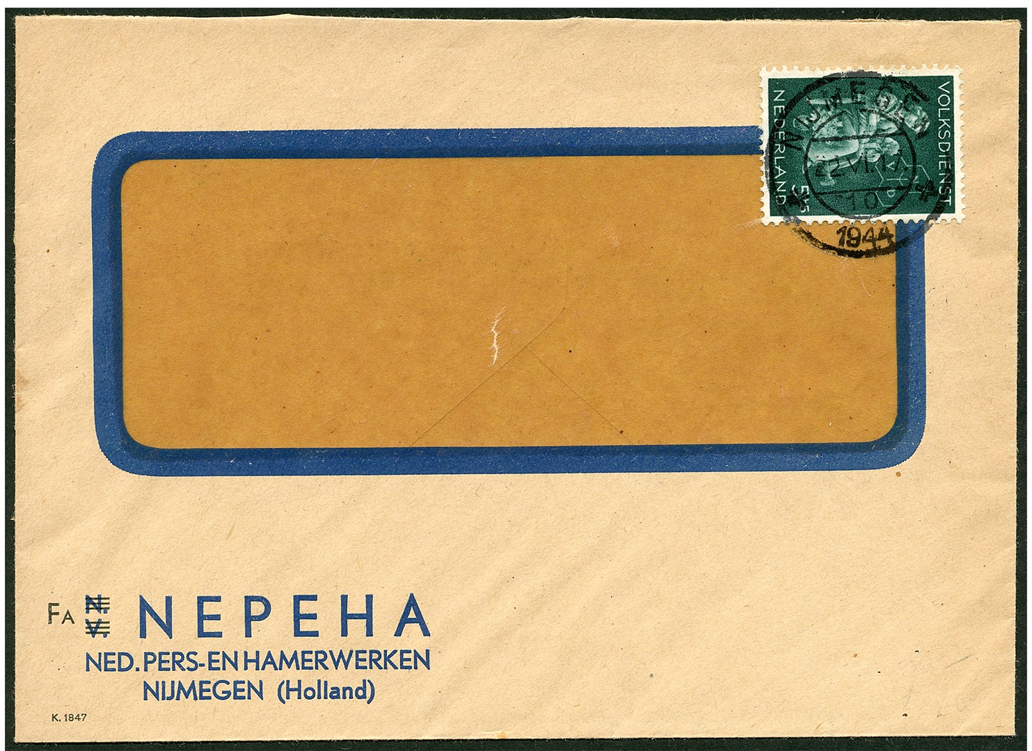 5 Cent Volksdienst nr. 425 als schaarse enkelfrankering op volgens lokaal tarief verz. vensterenvelop uit Nijmegen 22-6-1944, alsmede 7½c Nationale Hulp nr. 452 als enkelfrankering op vensterenvelop uit Enschede 30-8-1946