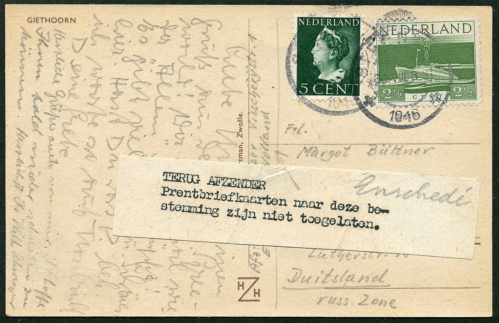 Prentbk. met groene frankering van Steenwijk 30-8-1946 met bestemming Duitsland, Russische Zone, maar beplakt met etiket TERUG AFZENDER/Prentbriefkaarten naar deze be-/stemming zijn niet toegelaten.´ (in Enschede opgeplakt?)