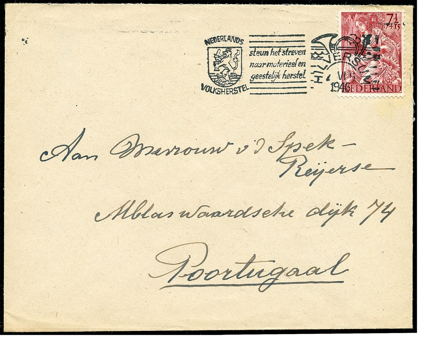 Nationale Hulpzegel van 7½c nr. 452 als enkelfrankering op env. van Hilversum 7-6-1947 via Rhoon 8-6 naar Poortugaal