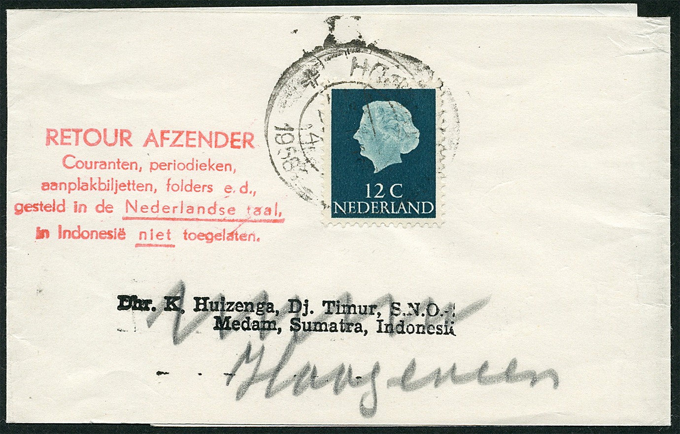 De Nieuw-Guinea kwestie. Omslagbandje gefr. met 12c afgest. Hoogeveen 3-2-1958 met bestemming Medan, Indonesië, maar ´RETOUR AFZENDER/Couranten, periodieken/aanplakbiljetten, folders e.d./gesteld in de Nederlandse taal./in Indonesië niet toegelaten.´