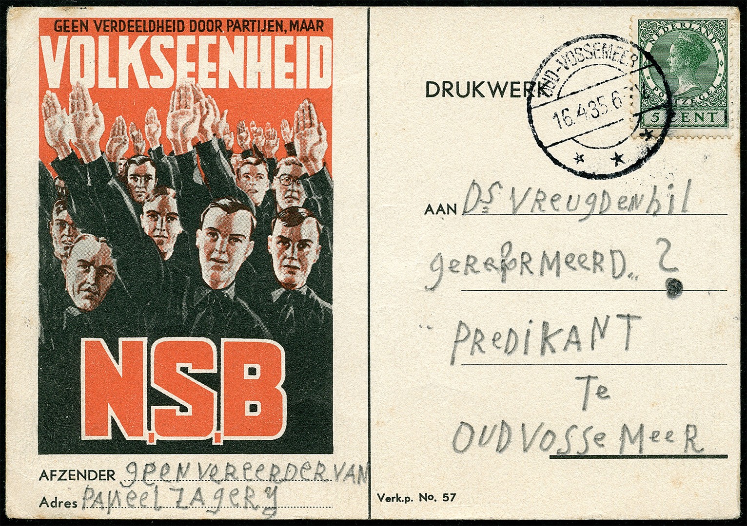 NSB-drukwerk (ook az.) geschreven door ´geen vereerder van paneelzagerij´ aan een dominee (´gereformeerd?´) te Oud-Vossemeer 16-4-1935 (info op internet). Curieuze voorloper voor elke (post)historische collectie Nederland WW2