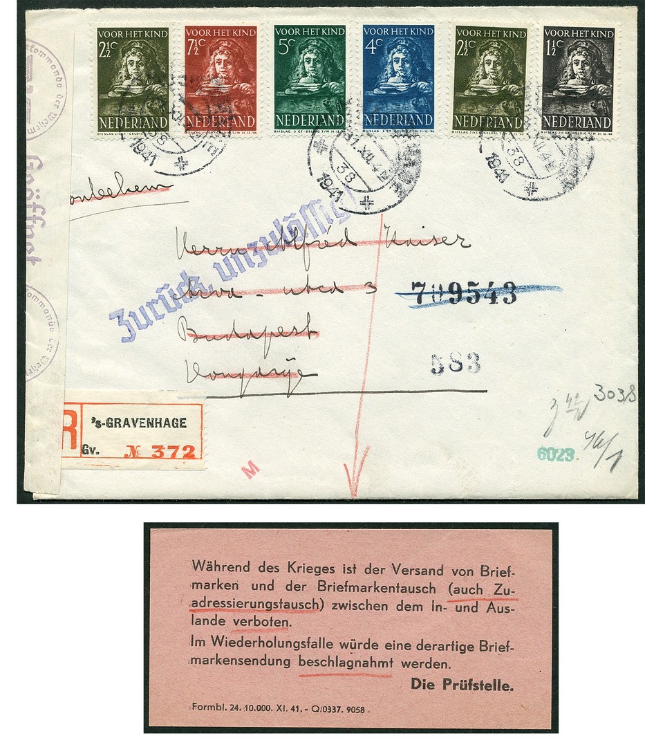 Kind 1941 op env. met inhoud (verzoek om toezending nieuwe zegels) aangetekend verz. van 'sGravenhage Oudjaar 1941 naar Hongarije, onderschept door de Duitse censuurdienst: verzenden en ruilen van postzegels is niet toegestaan. In env. zit bijgevoegd een roze strookje 'Während des Krieges...'