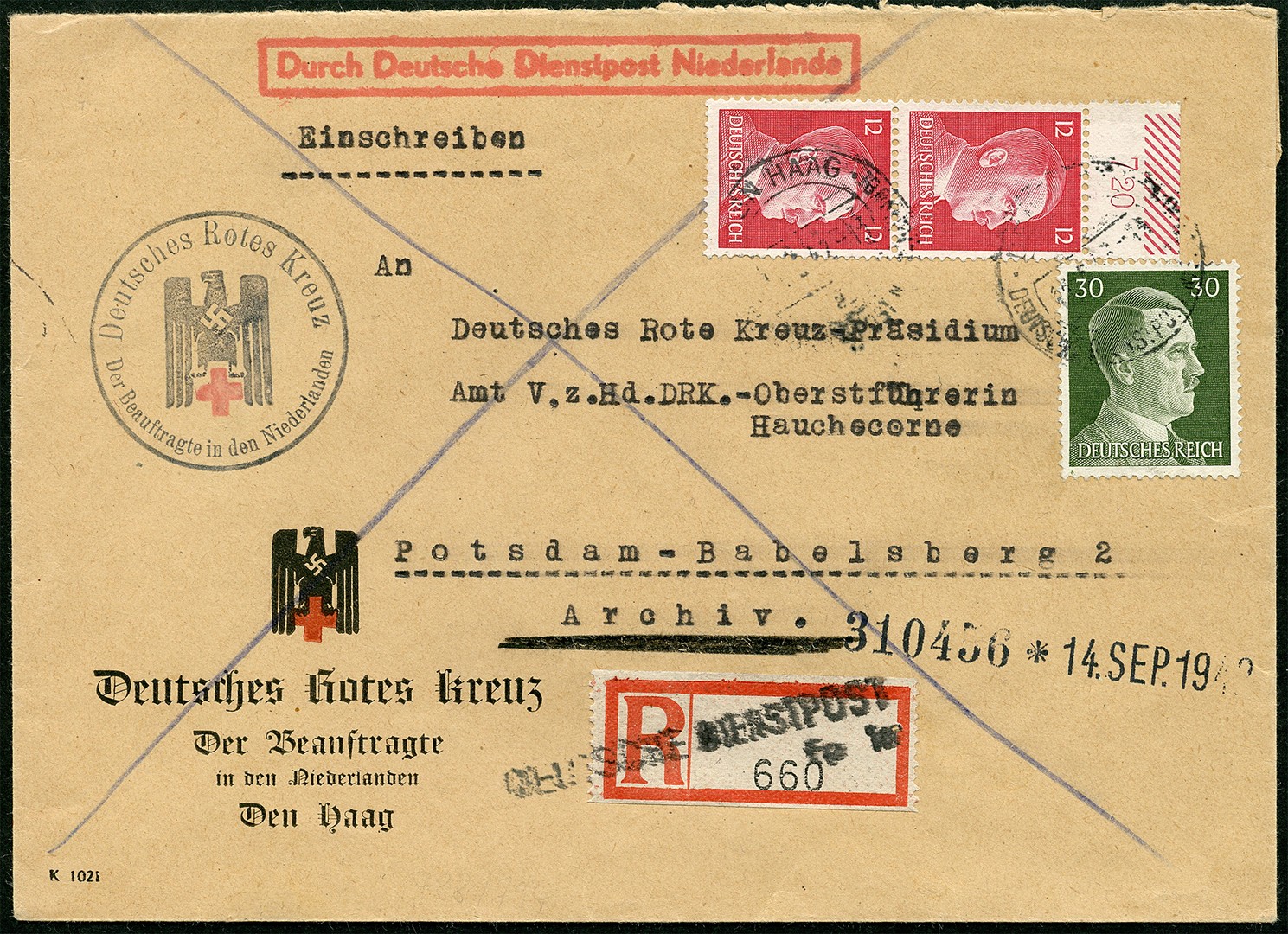 Couvert van het Duitse Rode Kruis ´Durch Deutsche Dienstpost Niederlande´ van Den Haag 13-9-1942 aangetekend naar Potsdam 14-9
