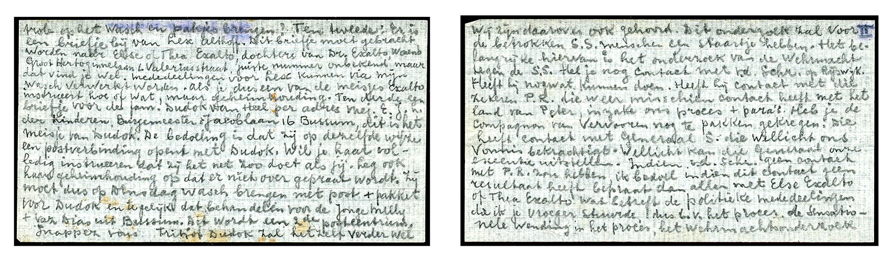 WASGOEDPOST. ACHT VOLGESCHREVEN PAPIERTJES VAN CA. 7 x 3,8 CM DIE ALS BRIEFJES, VERSTOPT IN HET OM TE RUILEN WASGOED, DOOR GOEDWILLENDE BEWAKERS NAAR BUITEN ZIJN GESMOKKELD VANUIT DE STRAFGEVANGENIS AAN DE GANSSTRAAT IN UTRECHT, DOOR DE BEZETTER ALS KRIEGSWEHRMACHTGEFÄNGNIS INGERICHT. DE BRIEFJES ZIJN AFKOMSTIG VAN RESERVE-OFFICIER A.L.J.E.M. (BROER) MOONEN. HIJ WAS WERKZAAM VOOR DE ORDEDIENST, EEN ONDERGRONDSE ORGANISATIE, MAAR NA TE ZIJN VERRAAD IN FEB. 1942 DOOR DE DUITSERS GEARRESTEERD. OP 7 AUG. 1943 IS MOONEN GEFUSILLEERD. BIJ HET KAVEL IS NAAST INFORMATIE OOK DE TRANSCRIPTIE VAN ALLE BRIEFJES GEVOEGD. TEVENS BIJGEVOEGD EEN VIA DE NORMALE POSTDIENST VERZONDEN ENVELOP VAN MOONEN, VIA ´sHERTOGENBOSCH-STATION 15-7-1943 NAAR FAMILIE IN DEN HAAG, MET OP DE VZ. IN VIOLET EEN DUITS CENSUURSTEMPEL UIT DE STRAFGEVANGENIS, ALSMEDE GECENSUREERDE BRIEF VAN 19-4-1942 DOOR GERRIT H. NALES UIT HET CONCENTRATIEKAMP NATZWEILER (VEEL INFO OP INTERNET). UNIEKE STUKKEN MET EEN GROTE HISTORISCHE BETEKENIS!