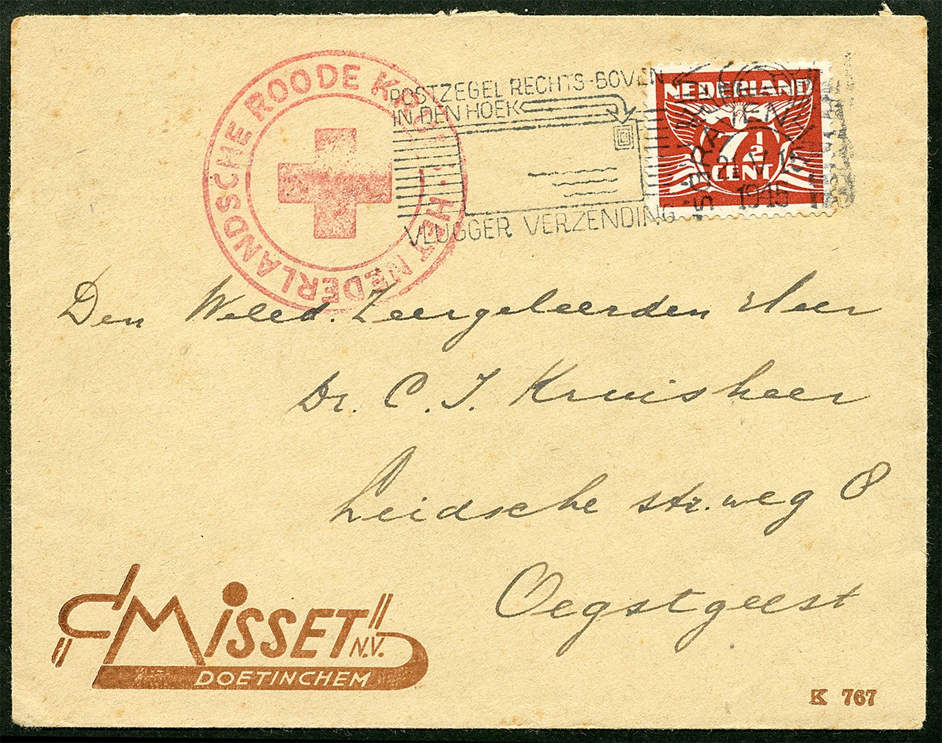 Rode Kruis. Firmacouvert uit Doetinchem gefr. met 7½c Lebeau, via het Roode Kruis van Oost naar West-Nederland waarna machinaal afgest. ´sGravenhage 21-5-1945 en verder naar Oegstgeest