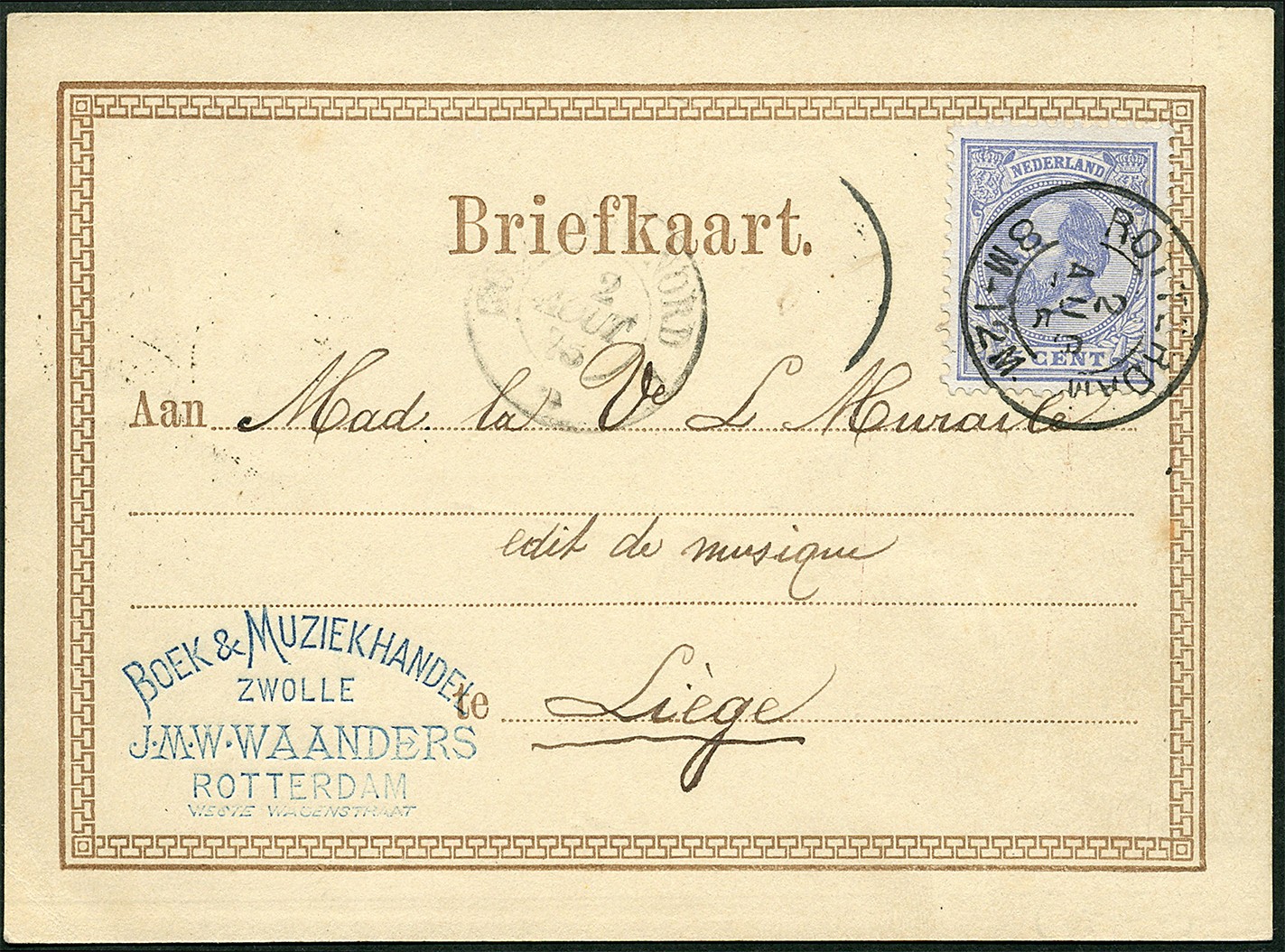 Bk-formulier GII waarop 5c en prachtig afzenderstempel ´Boek & Muziekhandel/Zwolle/J.M.W.Waanders/Rotterdam´ op 2-8-1875 naar Luik 2-8