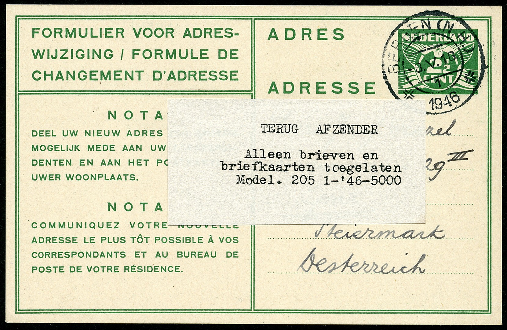 Vhk. G14 van Bergen (N.H.) 8-5-1946 met bestemming Graz (Oostenrijk), maar voorzien van retouretiket ´Alleen brieven en/briefkaarten toegelaten/Model. 205 1-´46-5000´
