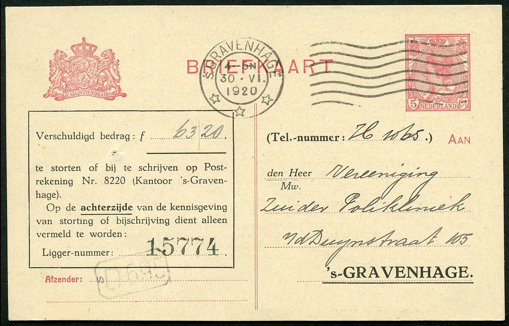 Particulier bedrukte bk. van de Gemeentelijke Telephoondienst van ´s-Gravenhage TEL103-Ia. Locaal verz. kaart (pingaatje) van 30-6-1920. Schaars!