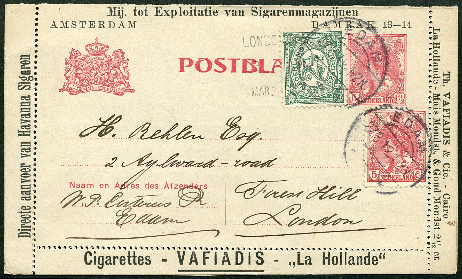 Particulier bedrukt postblad RPB10, bijgefr. met 2½c en 5c van Edam 27-3-1912 naar Londen 28(€)-3. Schaars!