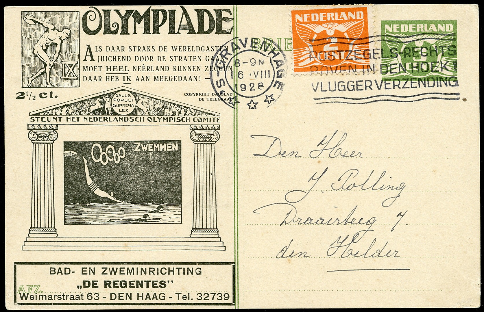 Particulier bedrukte bk. Olympiade 1928, OL29. Prachtkaart bijgefr. met 2c van ´s-Gravenhage 16-8-1928 naar Den Helder. De tekst betreft gewone familieaangelegenheden. Schaarse kaart, die uitsluitend in Den Haag is verkocht