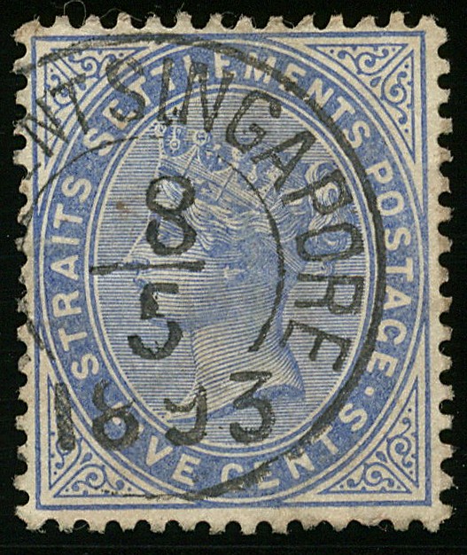 Kleinrond N.I.AGENT SINGAPORE met late datum 8-5-1893 op 5c Straits SG.65. Prachtex. met grootste deel van de afst. Zeldzaam! (SvL 125)