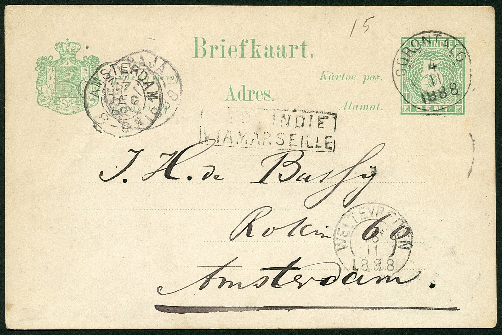 Bk. G8 van GORONTALO 4-11-1888 over Soerabaja 13-11 en Weltevreden 16-11 via Marseille naar Amsterdam 17-12. Prachtige afdruk van het zeldzame kleinrond (SvL 400)