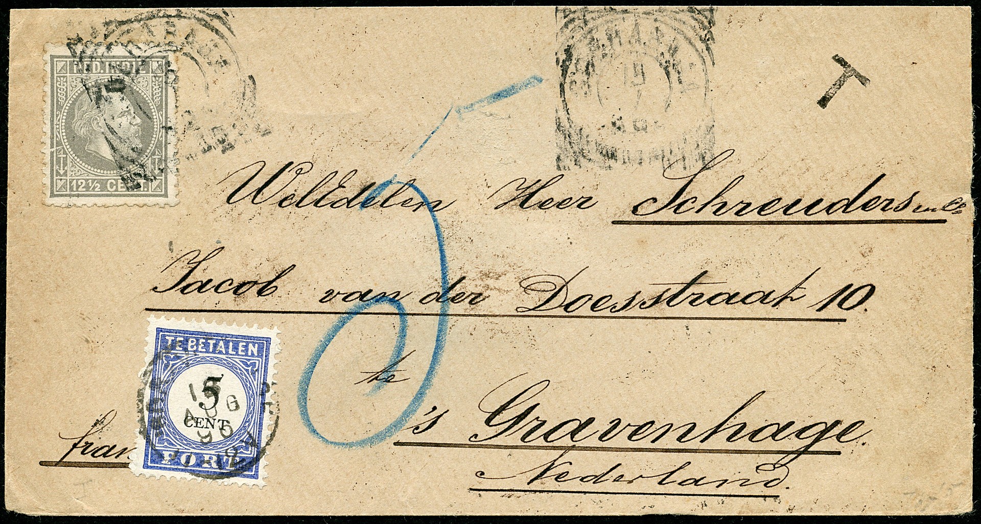 12½ Cent nr. 10 op env. van Soerabaja 15-7-1896 naar ´sGravenhage, daar op 18-8 met 5c P19a beport omdat er 2½ cent te weinig is geplakt