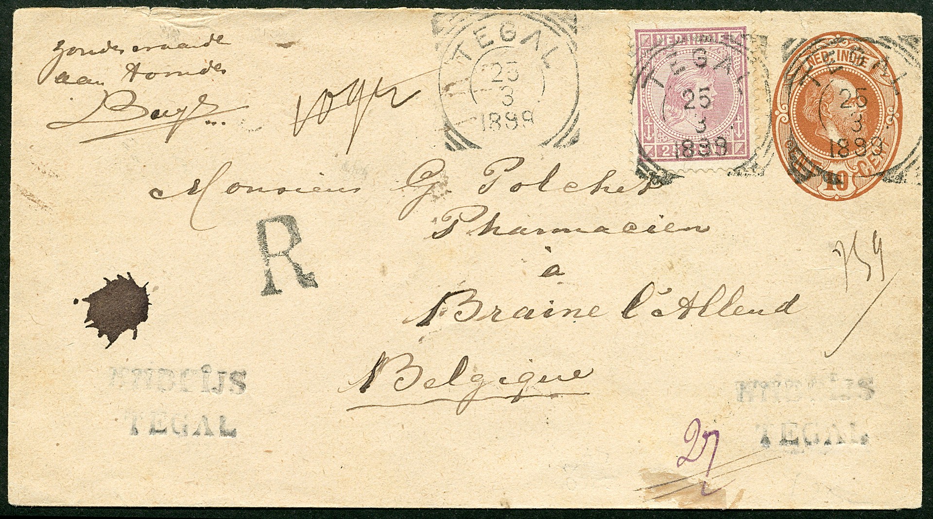 Bestemmingen. België. Enc. G6 bijgefr. met 25c Hangend Haar van Tegal 25-3-1899 aangetekend over Weltevreden en Brussel naar een apotheker in Braine-l´Alleud 25-4