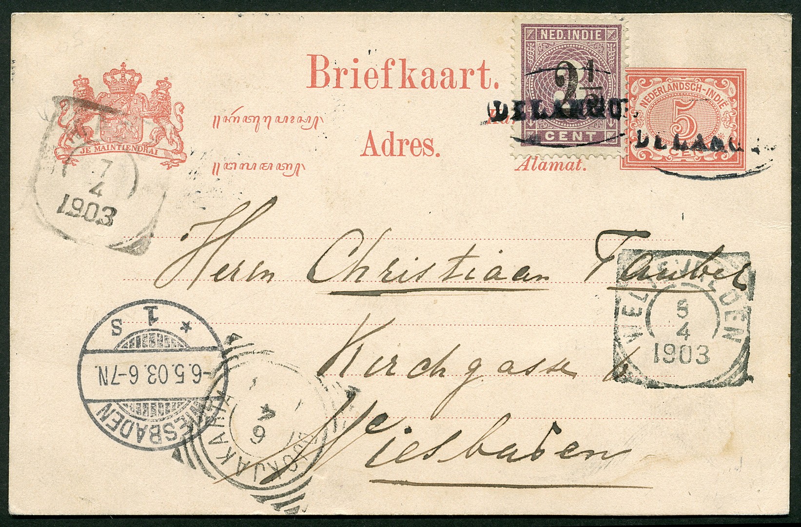 Bestemmingen. Duitsland. Bk. G14 bijgefr. met 2½c afgest. met ovaal haltestempel DELANGOE (langs N.I.S.-lijn) gebruikt door het hulppostkantoor, via Djokjakarta 6-4-1903, Maos en Weltevreden naar Wiesbaden 6-5