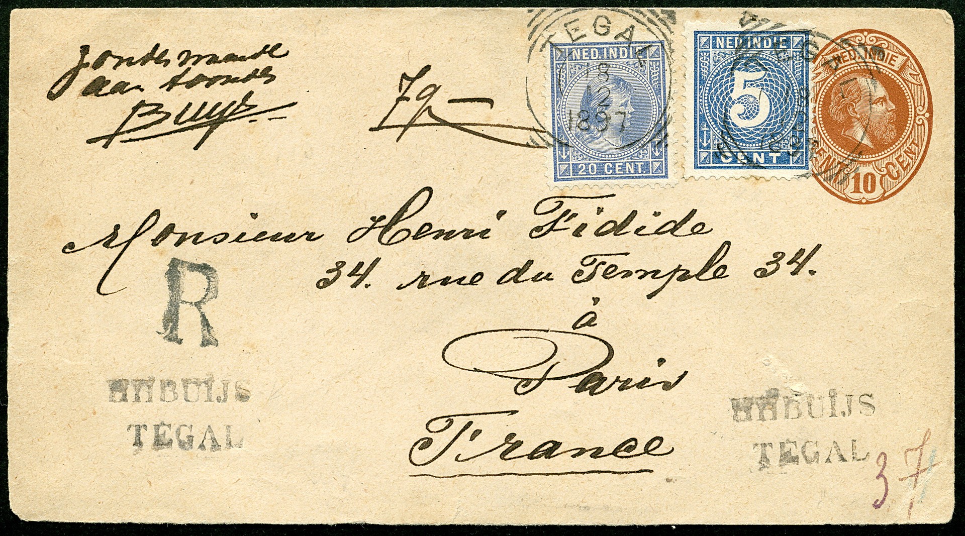 Bestemmingen. Frankrijk. Env. G6 met blauwe bijfrankering van 5c en 20c Hangend Haar van Tegal 18-12-1897 aangetekend via Weltevreden naar Parijs 8-1-1898