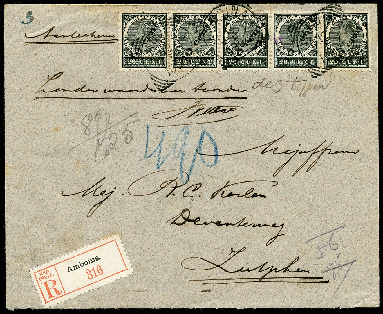 Couvert gefr. met 10 cent op 20 cent nr. 62 in strip van vijf waaronder geschreven ´de 3 typen´ van Amboina 12-5-1906 aangetekend over Soerabaja 19-5 naar Zutphen 19-6 (tevens twee losse, prachtig gebruikte zegels)