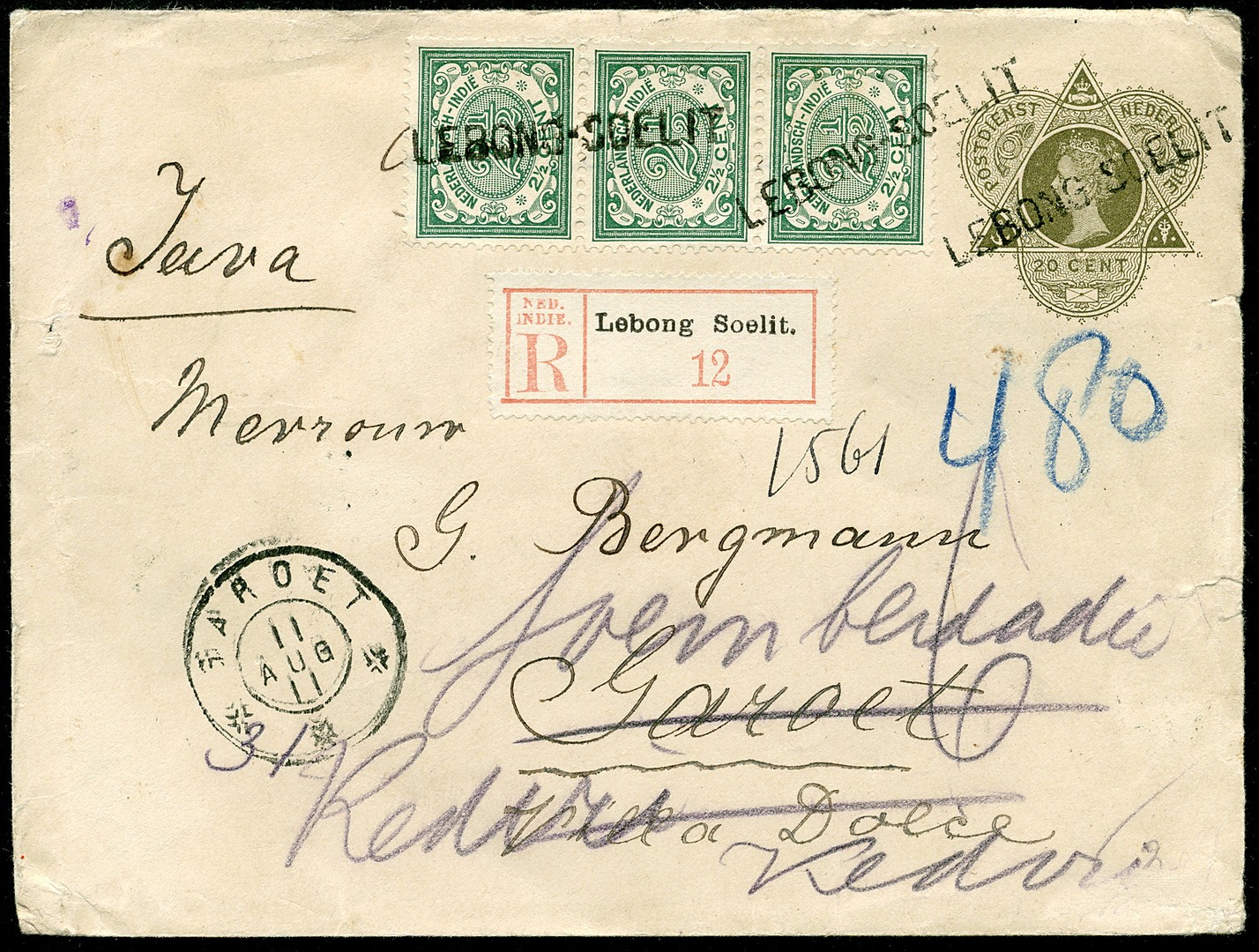 Env. G28 bijgefr. met 2½c in strip van drie afgest. naamstempel LEBONG-SOELIT, aangetekend naar Garoet 10-8-1911, op 11-8 over Maos doorgez. naar Kediri 12-8, met op az. postale notitie ´Dit stuk in dezen toestand alhier aangebracht en door mij verzekerd, CIII Abbink´ (CIII = commies 3e klasse) met 2 lakzegels