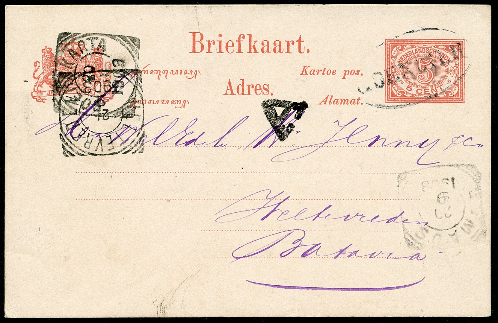 Haltestempels GOENDIEH (ovaalstempel, NIS) en MELANGBONG op twee bk. G14 via Soerakarta 20-9-1903 resp. Bandoeng 2-9-1903, beide naar Weltevreden