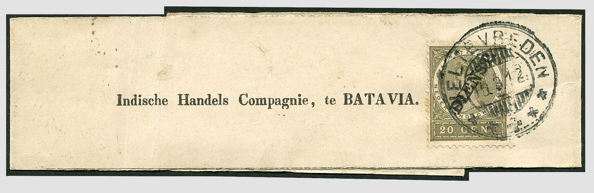 Dienst. 20 cent Veth met opdruk DIENST. nr. D21 als enkelfrankering op omslagbandje van Weltevreden 15-3-1912 naar Batavia. Zeldzaam!