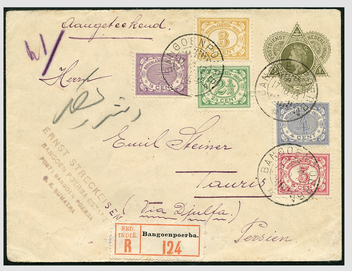 Kleurig bijgefr. env. G28 van Bangoenpoerba 17-10-1913 aangetekend via de N.I.Postagent Penang 20-10 (type GR, SvL 175) en Tuticorin 29-10 naar Tauris, Perzië 23-11