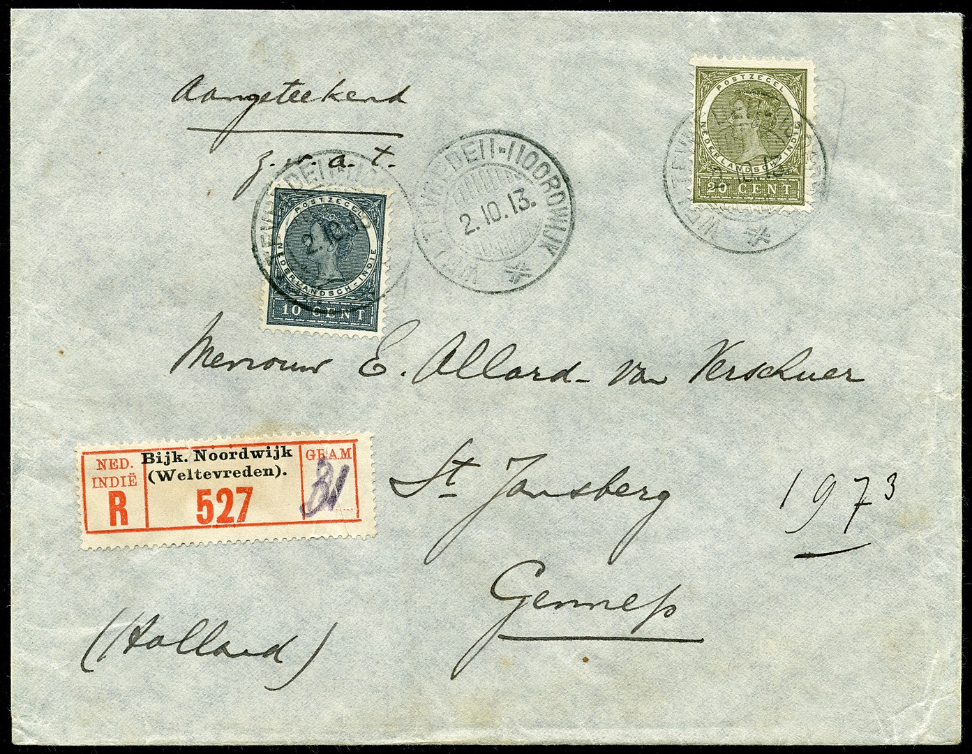 Env. van 31 gr. gefr. met 10c en 20c Veth van Weltevreden-Noordwijk 2-10-1913 aangetekend naar Gennep 27-10. Dit bijpostkantoor was nog geen 3 jaar opengesteld