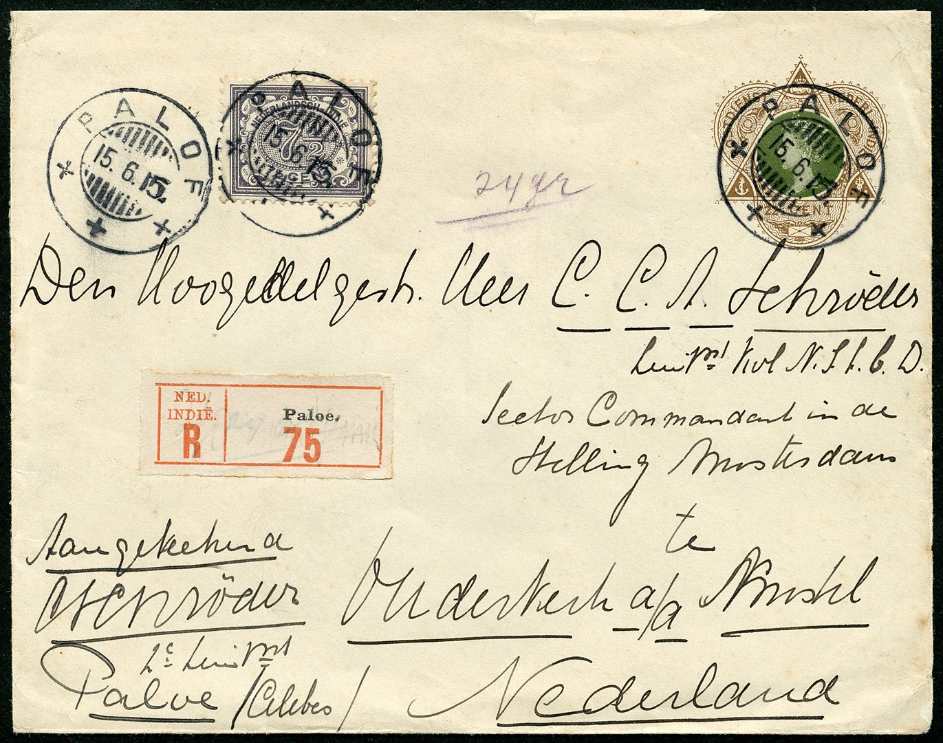 Env. G35 van 24 gr. bijgefr. met 7½c van Paloe 15-6-1915 aangetekend (ongeperforeerd R-strookje) naar Ouderkerk / a/d Amstel 31-7. Drie luxe afst. van dit op poststuk zeldzame kortebalkstempel van dit kleine kantoor op Celebes (KB, SvL R)