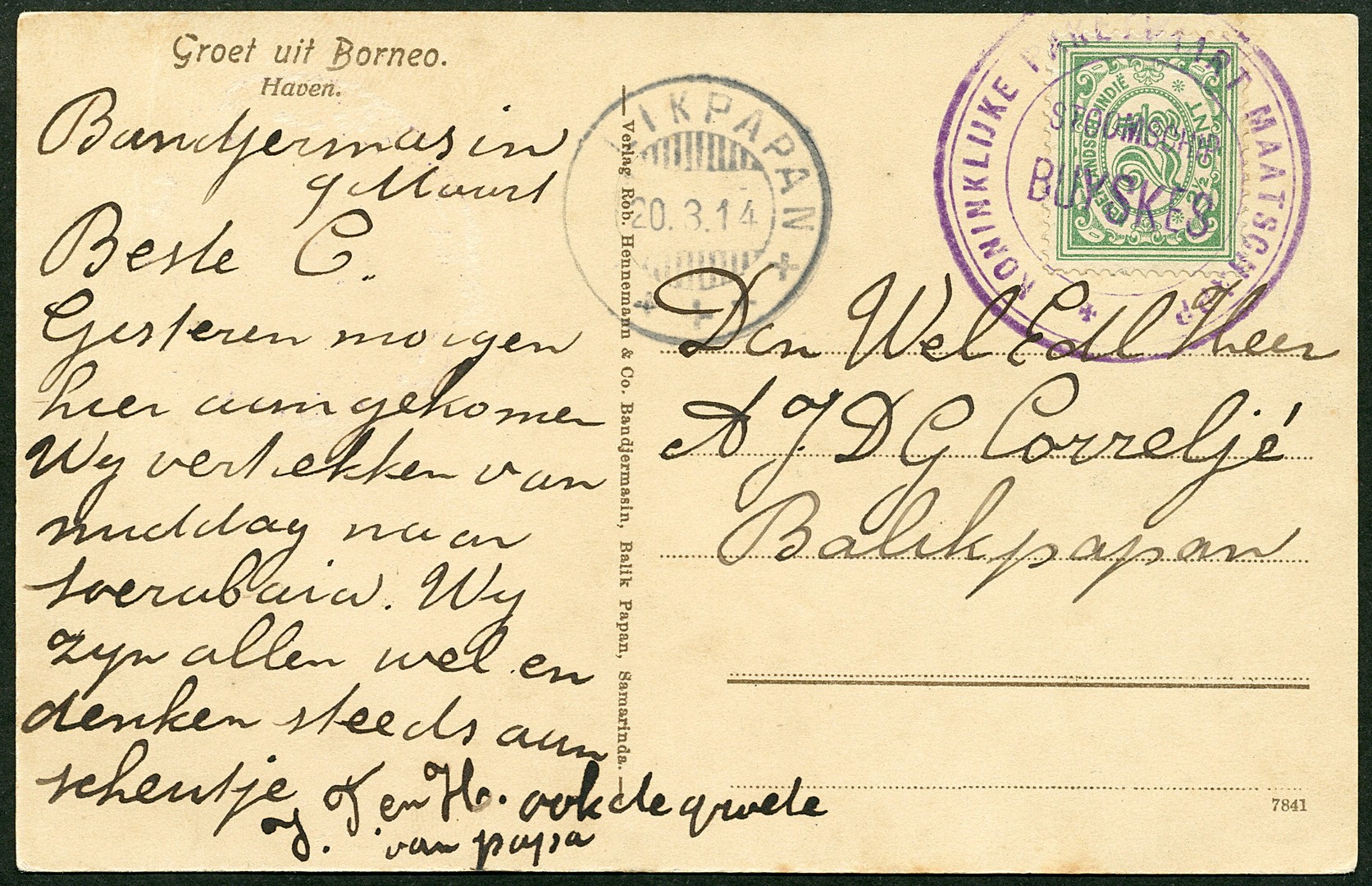 Scheepspost. Prentbk. gefr. met 2½c, geschreven te Bandjermasin 9-3, afgest. in violet met KPM-rondstempel ´STOOMSCHIP/BUYSKES´ naar Balikpapan 20-3-1914. Aan vz. een extra, luxe afdruk van dit stempel