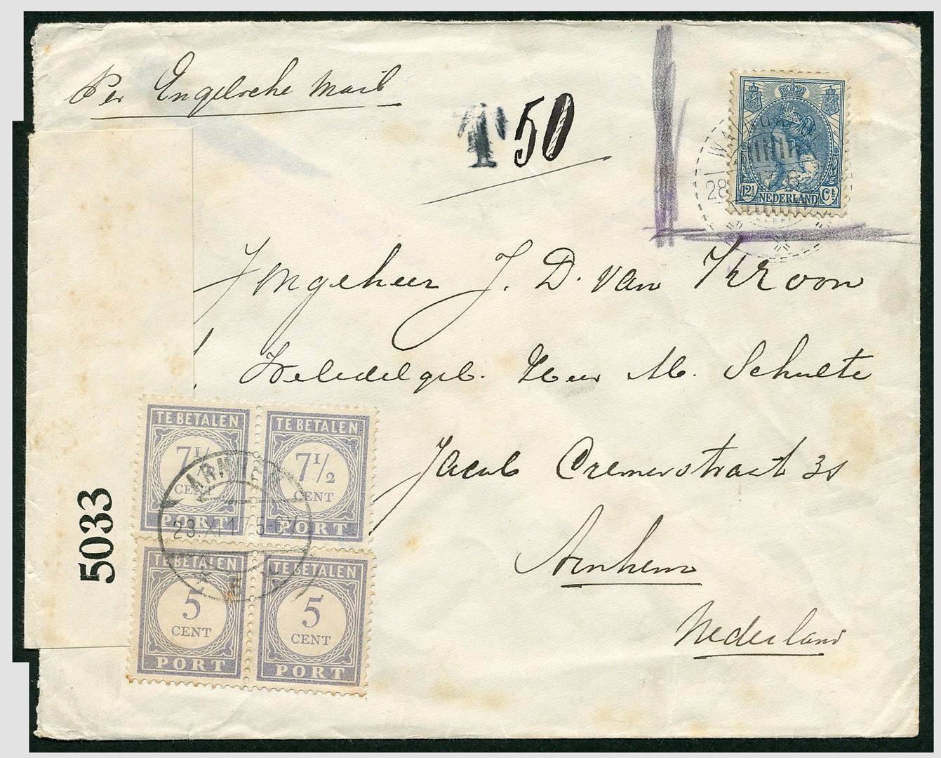 Env. gefr. met Nederlandse zegel 12½c Bontkraag van Waingapoe (op Soemba) 28-7-1917 met naast de gestempelde ´T´ geschreven ´50´ (goudcentimes), per Engelse mail en gecensureerd, naar Arnhem 23-11-1917, alwaar de ontvanger 25 cent port moest betalen omdat deze in Indië ongeldige zegel niet ter frankering werd geaccepteerd. Zeldzaam stuk van schaarse herkomst!