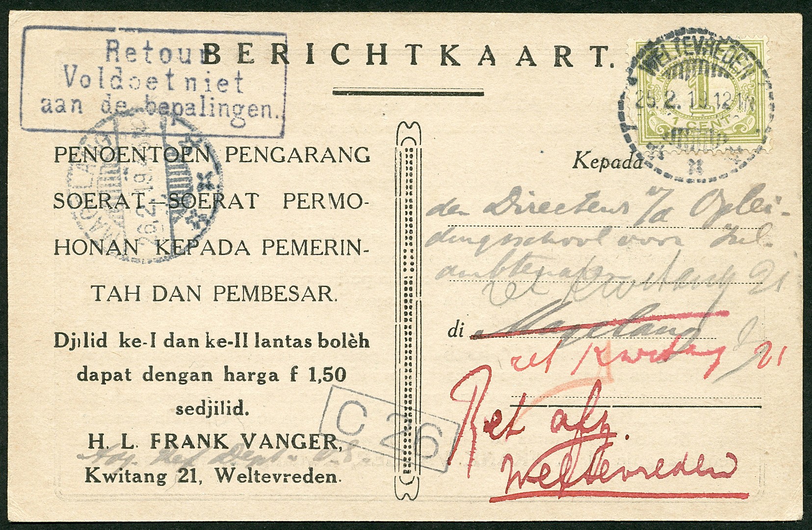´Berichtkaart´ gefr. met 1c (defect) van Weltevreden 25-2-1919 naar Magelang 26-2, daar gestempeld met ´Retour/Voldoet niet/aan de bepalingen.´ in kader. De kaart is gefrankeerd volgens drukwerktarief (1 cent), maar er is door de afz. linksvoor en aan de az. iets bijgeschreven waardoor het juiste tarief 5 cent had moeten zijn (briefkaarttarief). Uitermate zeldzaam administratief stempel