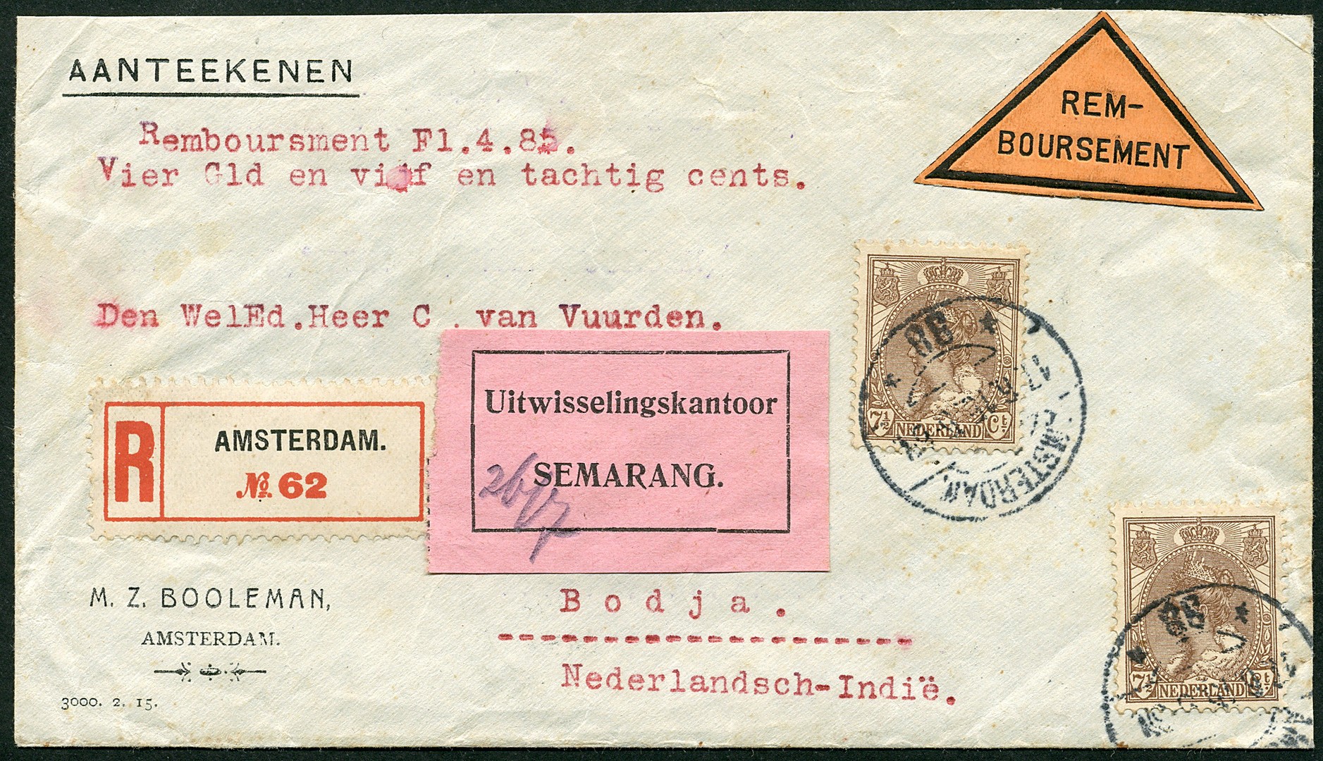 Zeer zeldzaam roze strookje ´Uitwisselingskantoor/SEMARANG´ (Lozon 1, RRR) op remboursbrief van Amsterdam 17-6-1915 over Semarang naar Bodja