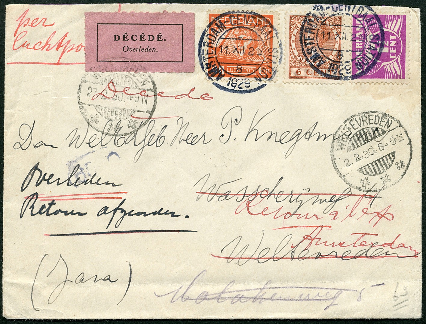 Zeer zeldzaam roze strookje ´Décédé./Overleden.´ (Lozon 2, RRR) op env. van Amsterdam C.S. 11-12-1929 naar Weltevreden 24-12, op 2-2-1930 retour