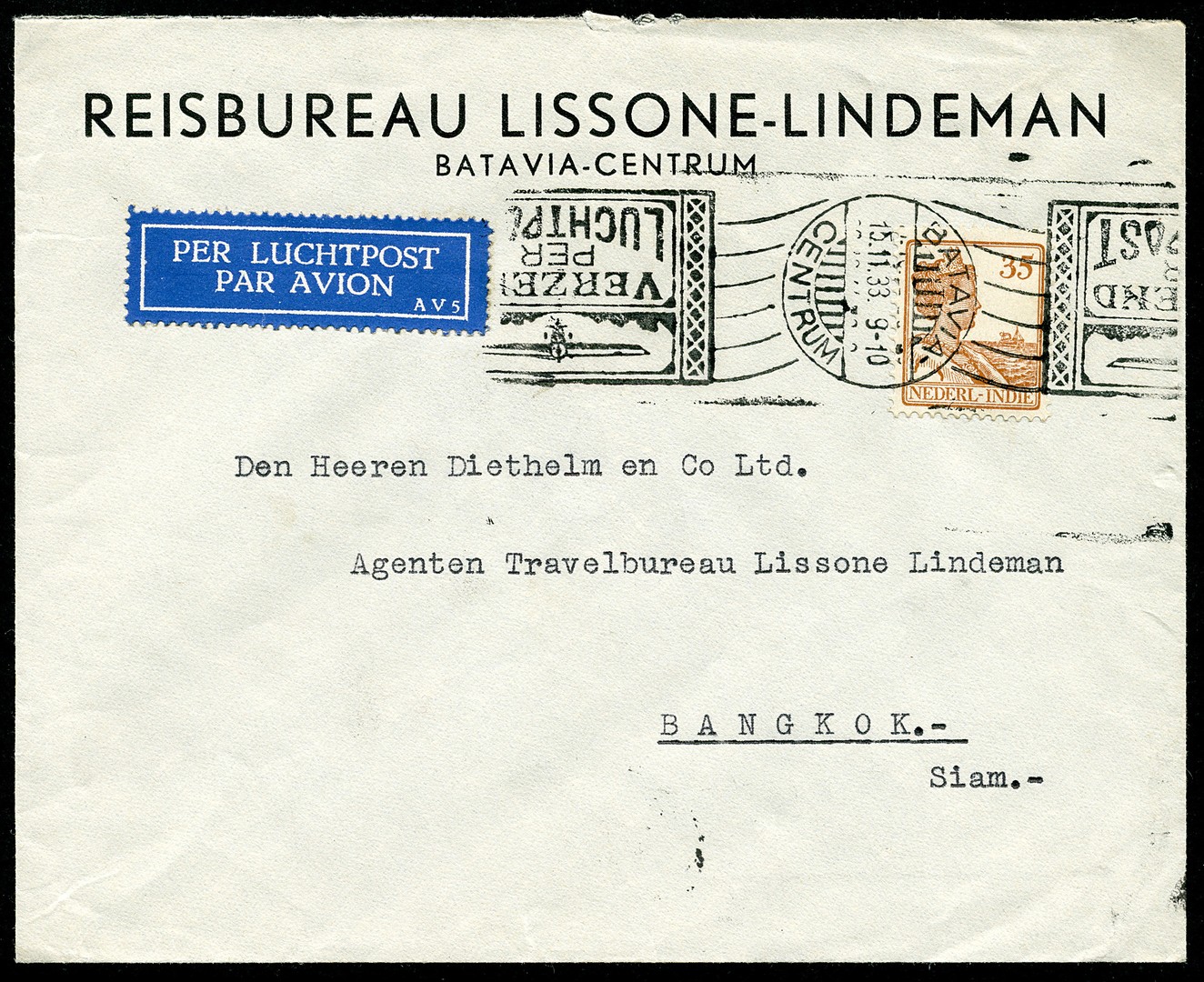 Firmacouvert gefr. met 35c van Batavia-/Centrum 15-11-1933 per luchtpost naar Bangkok 18-11. De zegel is met een handrolstempel (Bu. type 3) afgestempeld, wat op normale enveloppen hoogst zelden werd gedaan (RR)