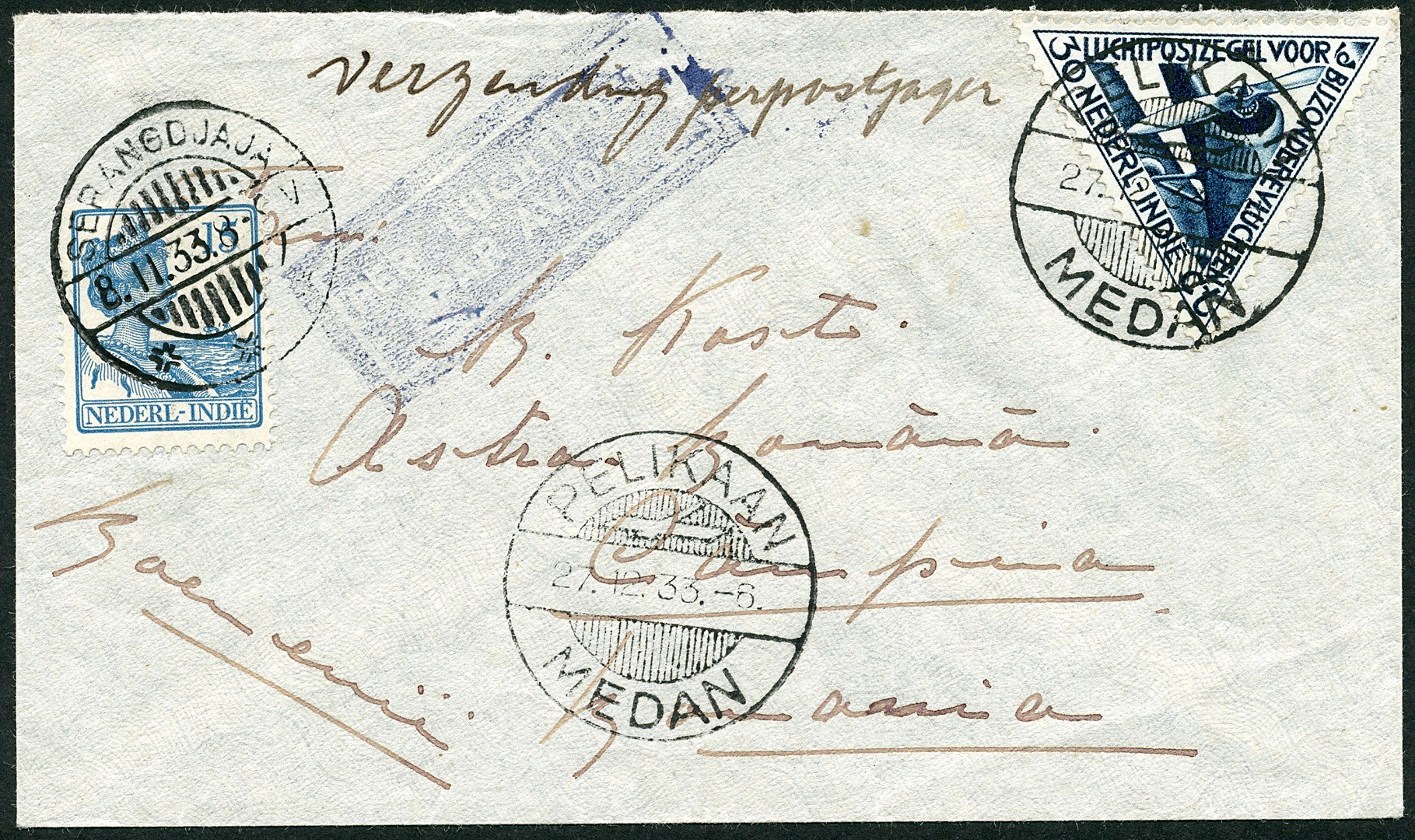 Env. gefr. met 15c uit SERANGDJAJA 8-11-1933 (SvL 275) niet per Postjager maar met de Pelikaan op 27-12-1933 naar Amsterdam C.S. 30-12 en verder naar Câmpina in Roemenië