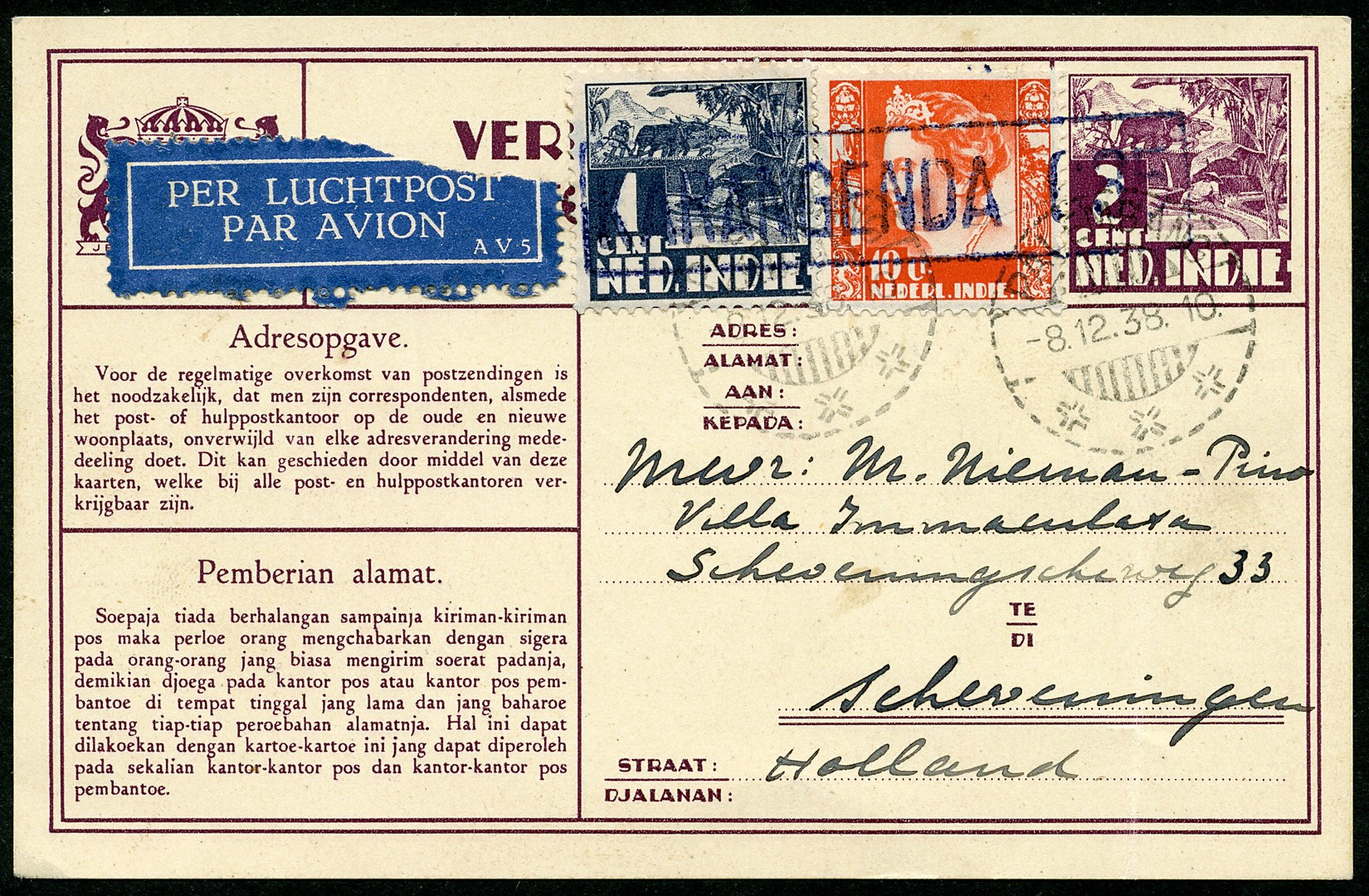 Vhk. G9 (kreukje) bijgefr. met 1c en 10c afgest. met haltestempel met nummer KARANGENDA 635 over Palembang 8-12-1938 per luchtpost naar Nederland