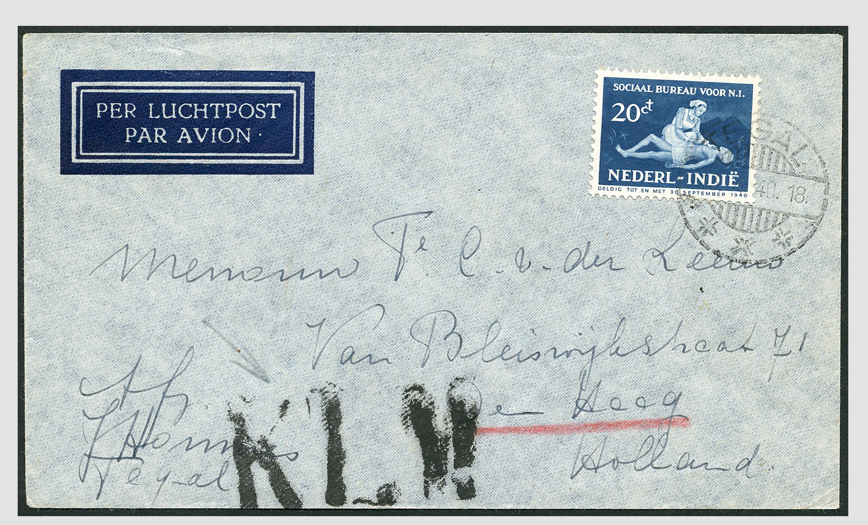 Drie verschillende stempels KLM op 3 luchtpostenverloppen naar Nederland, type van 16 mm lengte in violet uit Soengei-/Gerong 14-3-1939, van 22 mm lengte in violet uit Buitenzorg 27-6-1939 en van ca. 45 mm lengte in zwart uit Tegal 13-4-1940