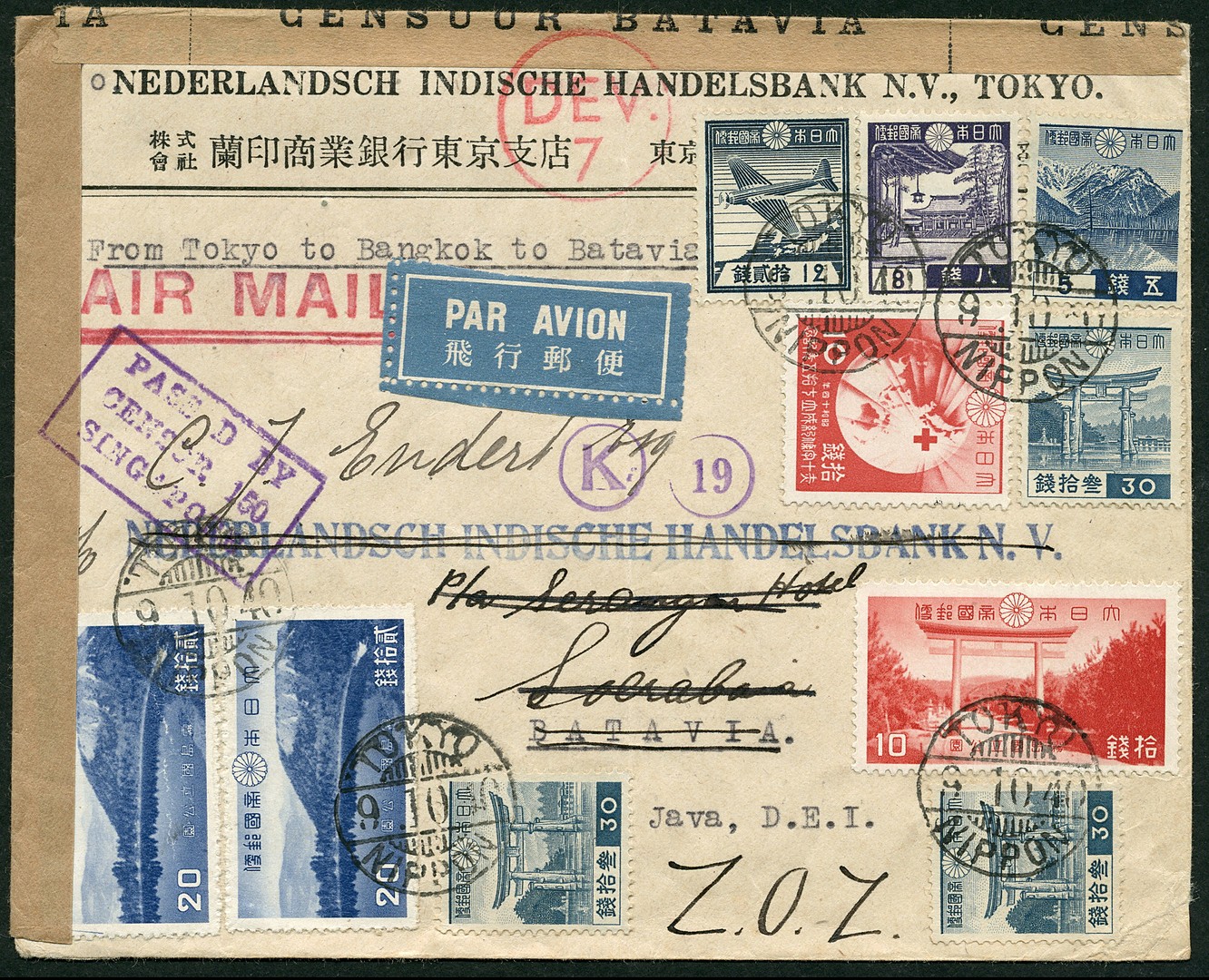 Kleurrijk gefr. firmacouvert van Tokyo 9-10-1940 per luchtpost via Bangkok en Singapore naar Batavia, met censuurstempels en stroken van Singapore en Batavia