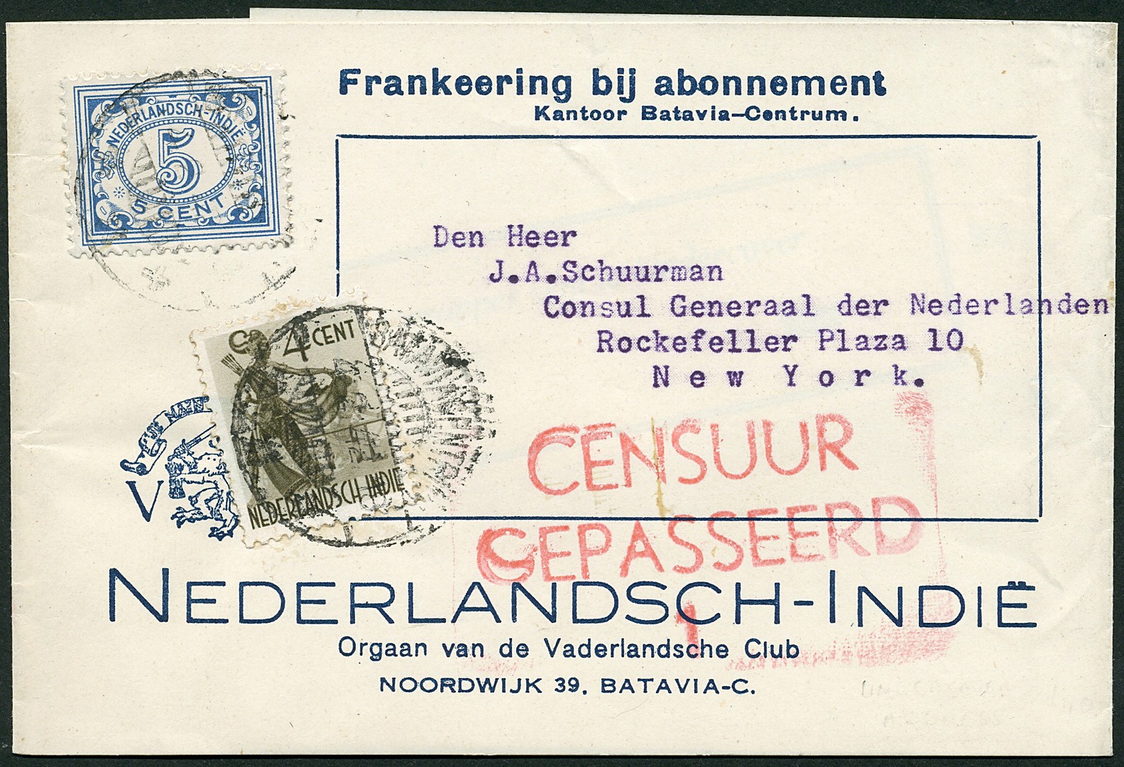 Omslagbandje van de Vaderlandsche Club (politieke partij) gefr. met 5c Cijfer en 4c danser, van Bataviacentrum 4-2-1942 naar een undercover adres in New York. Het gewicht lag tussen 100-150 gram, 3 cent per 50 gr = 9 cent (zie: NITAR p. 35, 76). Zeldzaam tarief!