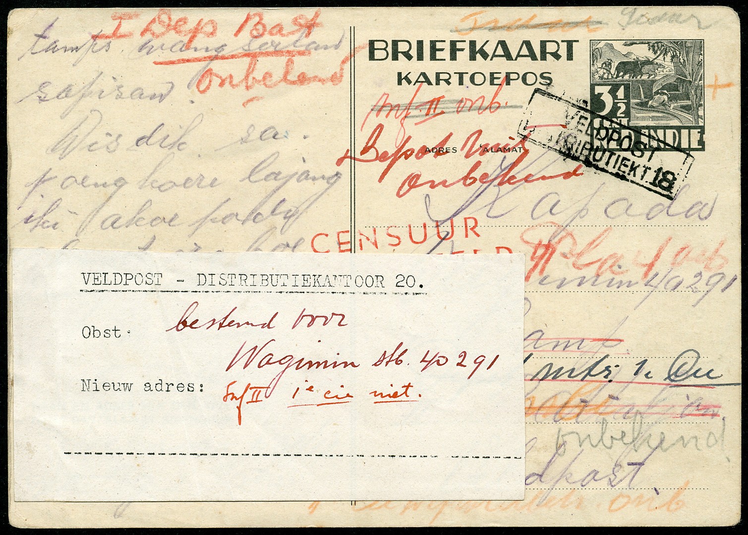 Bk. afgest. Veldpost/Distributiekt.18 van de ene Indonesische militair op zoek naar de andere, met vele postale notities