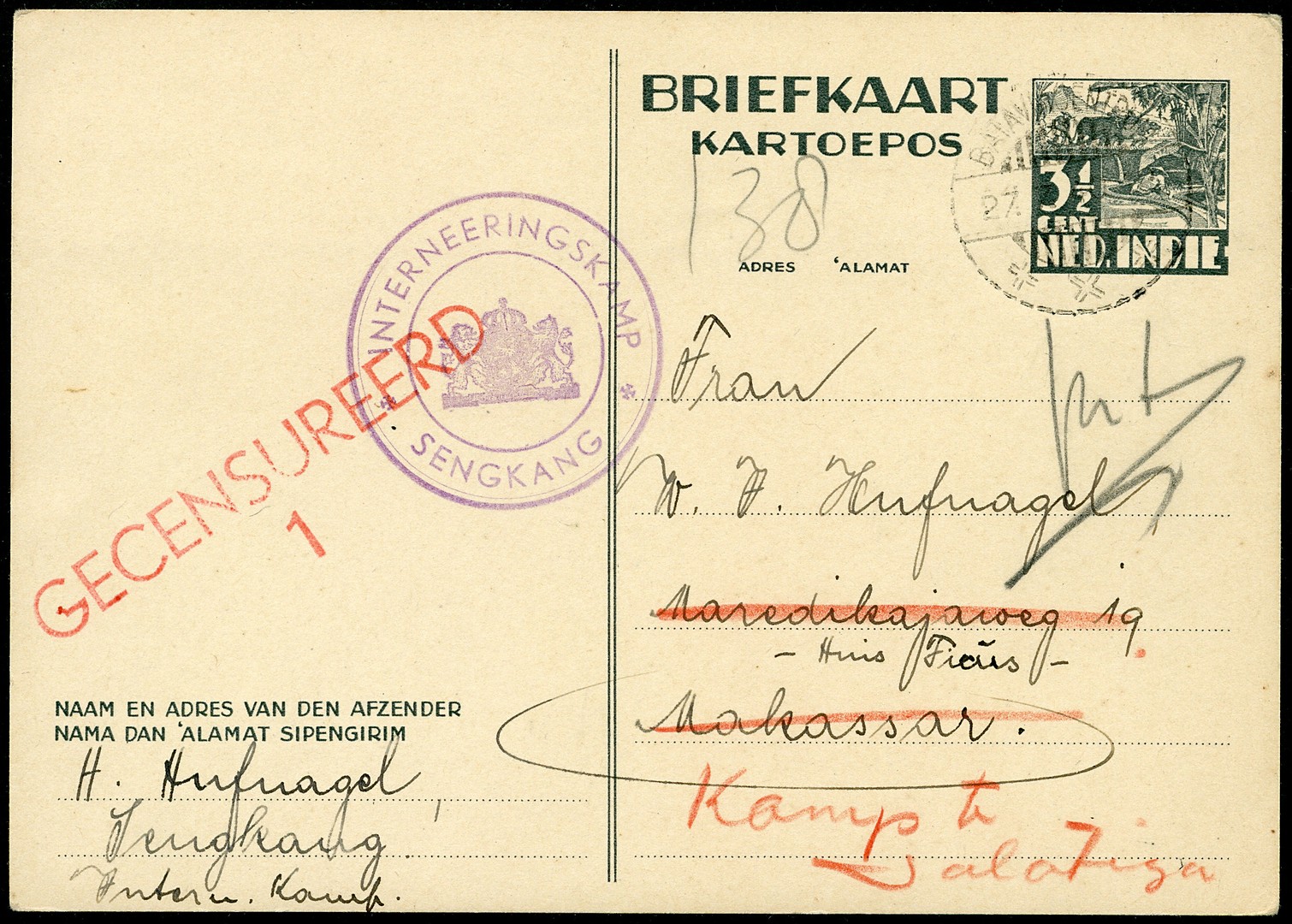 Interneringskampen. Twee bk. uit het Interneringskamp Sengkang (Celebes) via Bataviacentrum 27-7-1940 resp. 10-8-1940, doorgestuurd resp. direct naar het interneringskamp voor vrouwen te Salatiga. Beide kaarten met zeer mooie afst. van het kamp te Sengkang