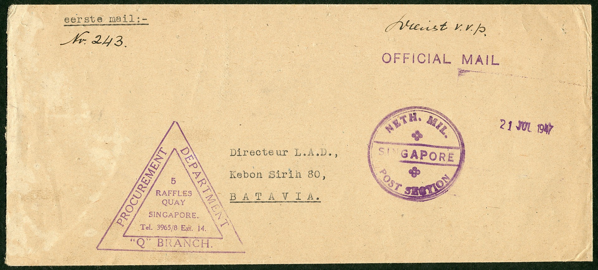 Langwerpige dienstenvelop met sublieme afst. ´Neth. Mil./Post Section/Singapore´ op 21-7-1947 naar Batavia (Bu. blz. 356 type 8)